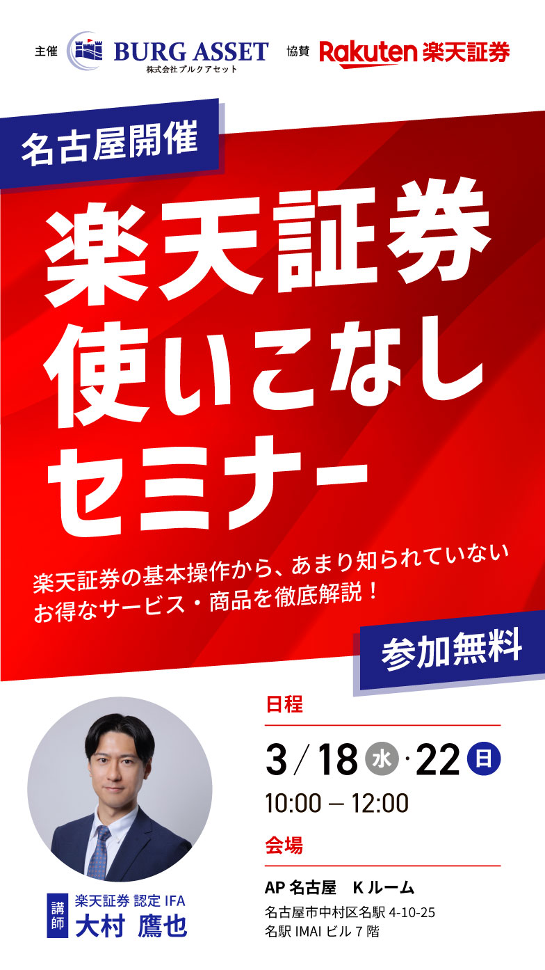 本セミナーでは、個別の金融商品の勧誘を行うことはございません。本セミナー後、弊社コンサルティングを希望された方へ、商品等の勧誘を行うことがあります。各商品等にご投資いただく際には商品毎に所定の手数料や諸経費等をご負担いただく場合があります。又、各商品等には価格の変動等による損失を生じる恐れがあります。各商品等へのご投資にかかる手数料等およびリスクについては、当該商品等の契約締結前交付書面、目論見書、お客様向け資料等をよくお読みになり内容について十分にご理解ください。